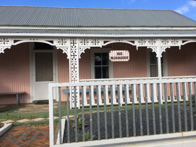 Die Blikhuisie is typical of the area the town was established in and made of corrugated tin sheets. These houses all had a lovely “stoep” so the owners can sit and have coffee and chat to all who wander past. If you have the time you are invited to join the coffee experience. Sadly this no longer happens as folk no longer make time to relax and chat to fellow humans. I just love the “broekie lace” framing the stoep. Not the traditional ones from that era, but still beautiful.